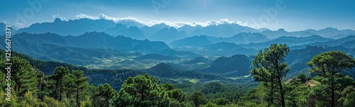 mountain, pine tree, blue skies, landscape, scenery, nature, outdoors, idylli, serene, tranquil, wood, horizon, peak, wilderness, greenery, tall trees, sunny, distant, clear sky, forest, environment, travel, tour tourism, peaceful, remote, calm, gorgeous, scenic, beauty, natural, mountain chain, panoramic, vacation, adventure, explore, view, peak, hill, plant, alive, colours, daylight, sunlight, season