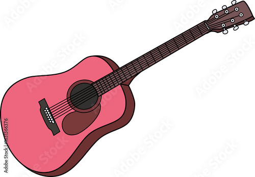 Pink acoustic guitar with dark brown details. Musical instrument concept. Hand drawn outline style for music education.