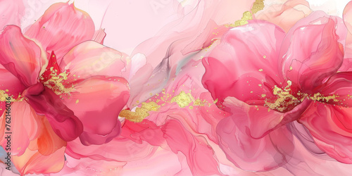 pink alcohol ink painting, pink floral pattern with gold accents on white background,Abstract pink gold watercolor paint liquid fluid marble texture, banner