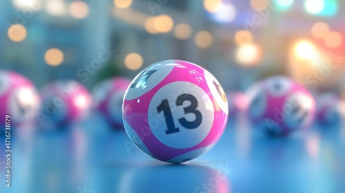 Pink and photo white lottery ball with number 13 in focus with blurred balls thirteen game