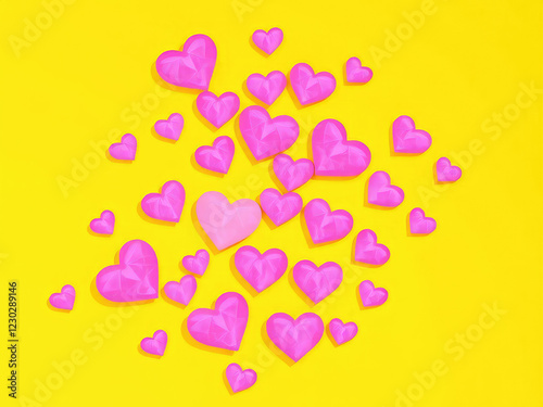 Pink and purple hearts arranged on yellow backdrop, vibrant, cute, design, ornament, lovely