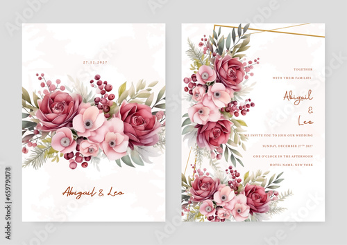 Pink and red rose and poppy elegant wedding invitation card template with watercolor floral and leaves