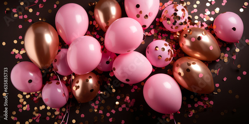Pink balloons background with confetti, sparkles, lights. Anniversary. Banner for birthday, party, Christmas, New Year, promotion social media cover. top view, flat lay Generative Ai