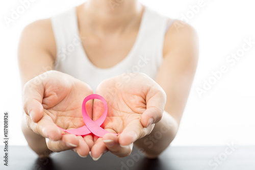 .Pink Breast cancer awareness ribbon holding by woman