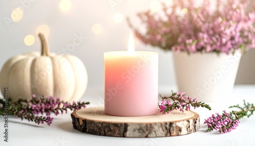 Pink candle on wooden circle, autumnal heather flowers and orange pumpkin on white table.
