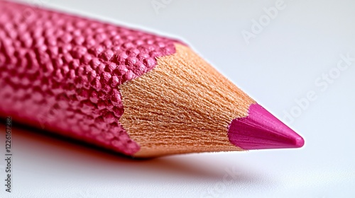 Pink Colored Pencil Point Close Up with Textured Barrel on White Plain Surface Macro Shot.