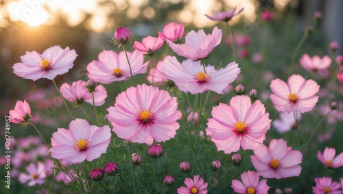 Pink cosmos flowers blooming in a garden during sunset with soft lighting and a blurred background Copy Space