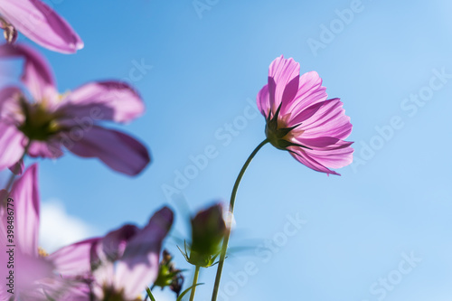 Pink cosmos flowers blooming in the garden wiht blue sky background.