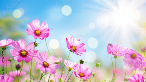cosmos, flower, pink, floral, blossom, bloom, summer, spring, nature, garden, field, meadow, blue skies, sunlight, bright, sunny, bokeh, background, beauty, beautiful, vibrant, fresh, cheerful, idylli, peaceful, serene, relaxing, outdoors, daylight, floral background, floral pattern, floral pattern, greeting card, invitation, positive, hope, growth, renewal, natural, botanical, flora, delicate, closeup, macro, soft focus, dreamy, seasonal