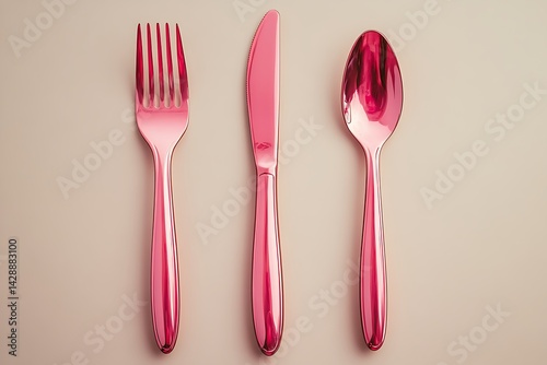 cutlery, silverware, flatware, pink, spoon, fork, knife, utensil, metal, shiny, cream, table setting, eating, dining, kitchen utensile, tableware, metallic, studio shot, aligned, plain, single object, kitchen, catering, eatery, party, celebration, glossy, polished, food, service, dinnerware, cooking, equipment, tool, isolated, white, utensil, silver, plastic, dinner, set, eat, table, steel, crockery, meal, vector