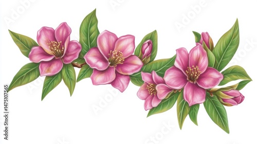Pink Dogwood Flowers and Buds in Full Bloom Artistic Illustration on White Background Close Up View Botanical Art
