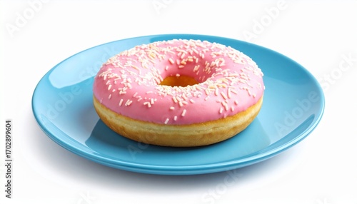 Pink Donut With Sprinkles On Blue Ceramic Plate Isolated On White, Side View, closeup