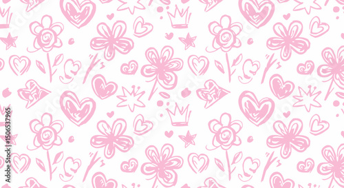 seamless pattern, floral pattern, texture, background, textile design, fabric design, wallpaper, wrapping paper, hand-drawn, vignetting, scribble, childlike, playful, decorative, design element, white background, flower, nubes, star, crown, princess, girlie, baby shower, pastel, light pink, feminine, sweet, innocent, romantic, love, celebration