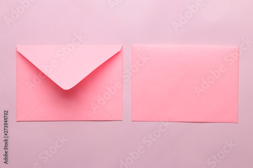 Pink envelope with a blank for text on a bright trendy pink background. top view