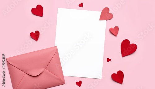 pink envelope with hearts and empty white paper card for text mockup for greeting