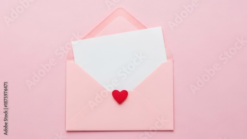 Pink envelope with white card and small red heart decoration.