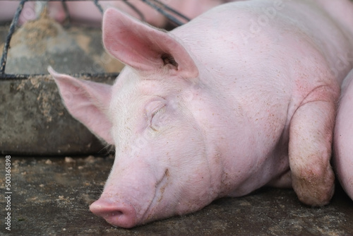 Pink fat pig sleeping and smile in livestock pig farm close-up.