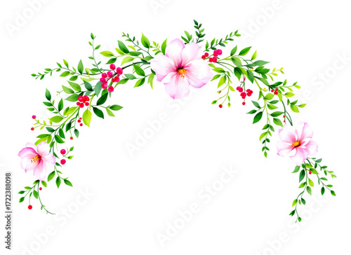 pink flower, green leaf, red berry, botanical, watercolor, illustration, decorative, elegant, spring, summer, nature, garden, wedding, design element, invitation, greeting card, border, frame, vector, clip art, blossom, bloom, foliage, fresh, vibrant, romantic, delicate, beautiful, hand-drawn, plant, decoration, natural, sweet, aethereal, festive, celebration, event, art, graphic, organic, cheerful, ornamental, charming