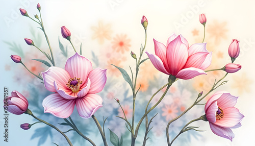 flower, blooming, watercolor, pink, stem, bud, floral, botanical, artwork, illustration, design, delicate, soft, gentle, drawing, art, decorative, background, pattern, element, spring, summer, nature, plant, growth, blossom, fresh, pastel, romance, romantic, beauty, flora, seasonal
