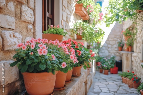 flower, street, narrow, village, mediterranean, stone, house, decoration, plant, pot, pink, summer, tour tourism, travel, alley, outdoors, nature, blooming, blossom, flower petals, picturesque, charming, idylli, peaceful, scenic, cosy, sunlight, shadow, perspective, architecture, traditional, europa