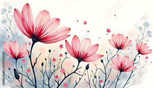 flower, blooming, watercolor, painting, floral, illustration, delicate, pink, tree branch, stem, artwork, botanical, nature, spring, bloom, artistic, drawing, design, pattern, graphic, element, creative, decorative, background, texture, light, soft, dreamy, romantic, still life, isolated, hand-drawn