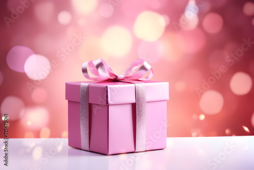 Pink gift box, with a shiny bow on a festive pink background. Holiday gift.