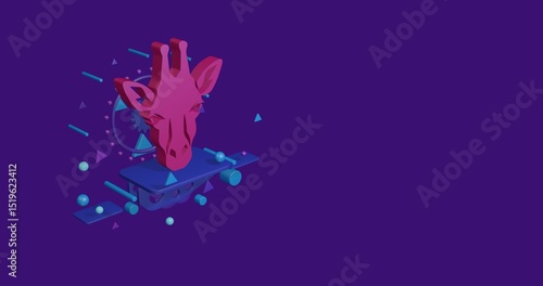 Pink giraffe head symbol on a pedestal of abstract geometric shapes floating in the air. Abstract concept art with flying shapes on the left. 3d illustration on deep purple background