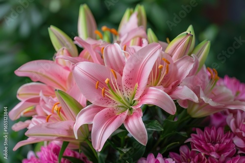 Pink lilies blooming beautifully in a floral bouquet arrangement, creating a vibrant and captivating display