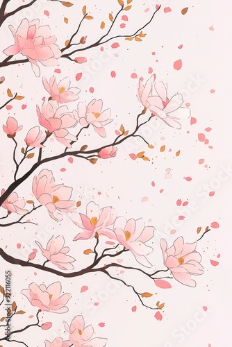 magnolia, blossom, flower, bloom, pink, tree, tree branch, flower petals, falling, spring, nature, floral, delicate, graceful, romantic, botanical, illustration, design, art, background, wallpaper, pattern, texture, feminine, beauty, softness, pastel, light, airy, aethereal, fragile, tranquil, serene, elegant, stylish, minimal, simple, subtile, abstract