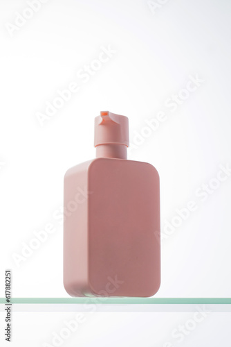 Pink mock-up of a cosmetic product with a place for a logo on a glass shelf. Shampoo, shower gel.