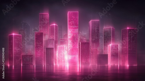 Pink neon holographic cityscape at night. Futuristic metropolis architecture. Ideal for music album covers, posters, and website backgrounds.