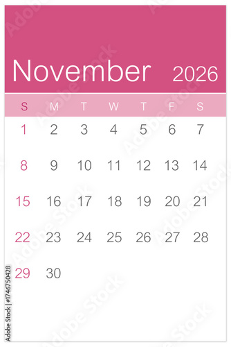 Pink November 2026 Calendar page isolated on white background, Saved clipping path.