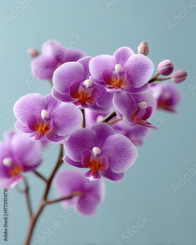 orchid, purple, flower, macro, closeup, botanical, nature, floral, delicate, vibrant, flower petals, bloom, blossom, plant, detail, fragile, elegant, beauty, garden, tropical, exotic, pink, magenta, orange, center, stem, tree branch, soft, background, blue, light, lighting, studio, photo, cinematic, hd, organic, growth, life, art