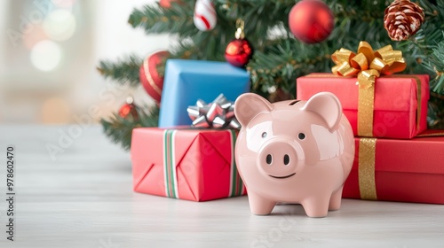 Pink piggy bank with Christmas gifts under decorated tree, representing holiday savings and financial planning.