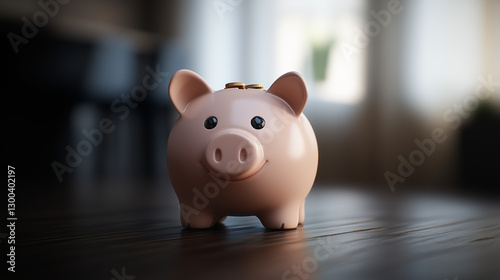 Pink piggy bank with coins on top placed on wooden surface