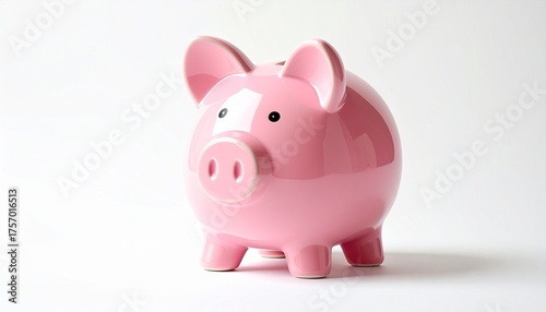 Pink piggy bank with glossy finish and coin slot on white surface for editorial personal finance budgeting children’s financial education and savings-themed visuals