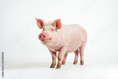 pig, baby pig, pink, white, background, standing, curious, expression, clean, well-groomed, farm, animal, farm animal, agriculture, cute, adorable, funny, happy, healthy, young, small, snout, ear, hoof, tail, portrait, pet, life, rural, country, nature, wildlife, wild, domestic, scene, care, welfare, husbandry, breeding, industry, pork meat, bacon, ham, sausage, food, meat, farming, behaviour, emotion