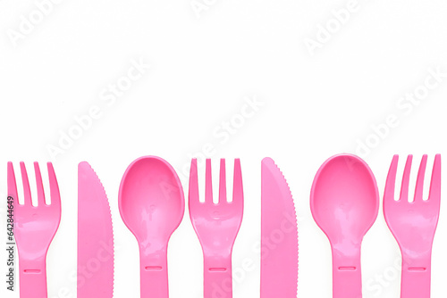 Pink plastic spoons, forks, knives for camping, isolated on white