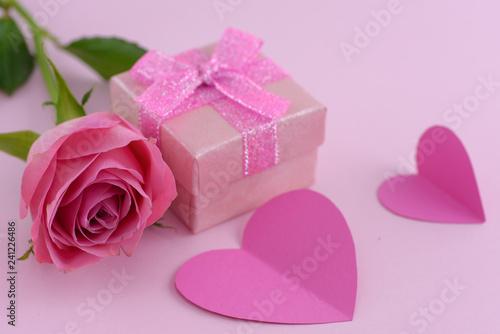 Pink rose and a gift box with hearts, valentine day background
