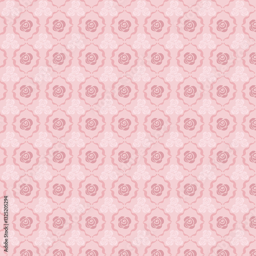Pink rose medallion pattern on pale background. Seamless feminine floral design perfect for romantic fabrics, wallpapers, wedding stationery, and decor projects.