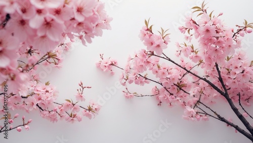Pink sakura flowers in spring set against a white background.