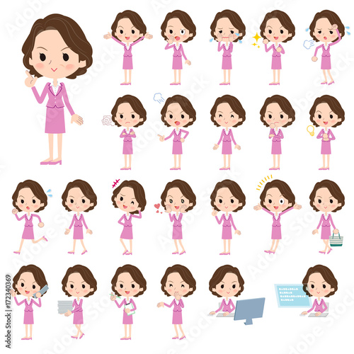woman, employee, suit, business, pink, middle-aged, politician, smile, smile, walk, run, surprised, sad, rejoice, attention, work, fatigue, discovery, consent, call, mobile phone, bag, shopping, idea, communication, personal computer, note, character, sweet, expression, set, variation, pose, illustration, flat