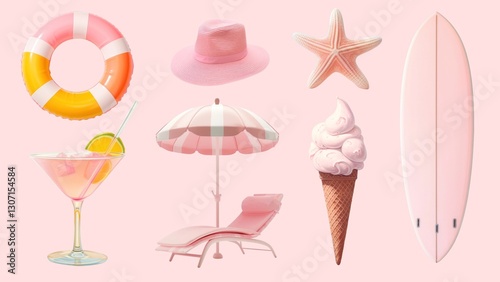 summer, beach, beach umbrella, beach chair, pink, hat, three-dimensional, surfboard, starfish, tropical, element, chair, sun, drink, summer getaway, ice cream cone, accessory, ice cream, cocktail, umbrella, graphic, glasses, ice, relaxation, holiday, vacation, cream, fun, essential, leghorn, feminine, lounge, item, straw, theme, vibe, cone, ice cream, lifebuoy