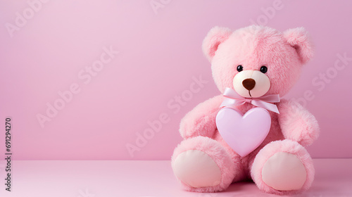 Pink teddy bear with a pink heart on a pink background with copy space.