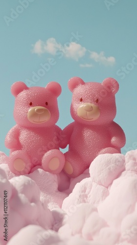 Pink toy bears on fluffy clouds. AI.