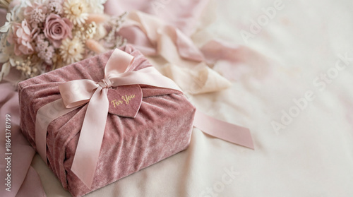 Pink velvet gift box tied with a satin ribbon bow and a for you heart tag, placed next to a romantic bouquet of dried flowers, symbolizing love, celebration, and special occasions