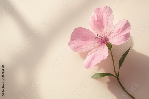 flower, pink, geranium, shadow, background, neutral, beige, minimalist, aesthetic, nature, floral, plant, blossom, bloom, delicate, soft, light, beauty, elegant, simple, natural, botany, spring, summer, garden, wildflower, macro, close, up, detail, copy, space, design, decoration