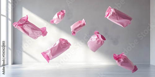 Pink Wrapped Candies Floating in Air, Surreal Modern Artwork for Unique Spaces, Subtle and Fresh Ambiance, Contemporary Design