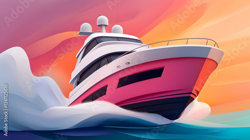 yacht, boat, luxury, water, ocean, sea, sunset, sunrise, pink, red, white, wave, speed, travel, cruise, summer, vacation, leisure, nautical, marin, ship, vessel, transportation, watercraft, vehicle, art, illustration, digital artwork, abstract, colourful, dynamic, movement, energy, powerful, elegant, modern, stylish, design, graphic, artwork, image, picture, photo, visual, high-coloured, vibrant, horizon, sky