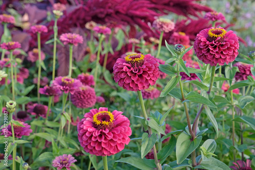 Pink, yellow and lime green Zinnia elegans, or common zinnia ‘Queen Lime Red’ in flower.
